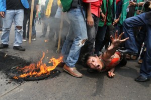 Mahasiswa dari Koalisi Mahasiswa Makassar melakukan aksi teaterikal saat melakukan aksi menolak RUU KAMNAS di depan kompleks DPR-RI, Jakarta, Jumat, 19 Oktober 2012. Dalam aksinya, Koalisi Mahasiswa Makassar menyatakan keprihatinannya atas agenda pembahasan RUU KAMNAS yang di nilai tidak berpihak pada penegakan demokrasi dan merupakan usaha mengembalikan kekuasaan kepada militer. – The Jakarta Post / Jerry Adiguna