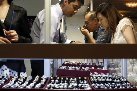 Pengunjung memilih perhiasan yang di tawarkan pada pameran perhiasan “Jakarta International Jewellry Fair 2010” di Jakarta Convention Centre, Kamis, 3 Juni 2010. Pameran yang berlangsung hingga tanggal 6 Juni 2010 mendatang tersebut diramaikan oleh sejumlah penjual perhiasan berskala nasional dari Singapura, Malaysia, Hongkong, Thailand, Cina dan India. == JP/ J. Adiguna
