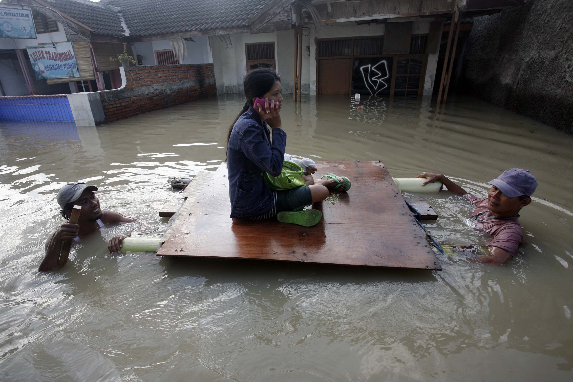 Seorang perempuan melakukan percakapan via telephon genggamnya saat menaiki rakit darurat untuk melihat rumah yang terendam banjir di kompleks perumahan Bintang Alam, Kerawang, Jawa Barat, Kamis, 25 Maret 2010. Ribuan rumah di sepanjang bantaran sungai Citarum JAwa Barat masih tergenang air hingga kini sehingga menyebabkan ribuan warga terpaksa mengungsi. == JP/ J. Adiguna