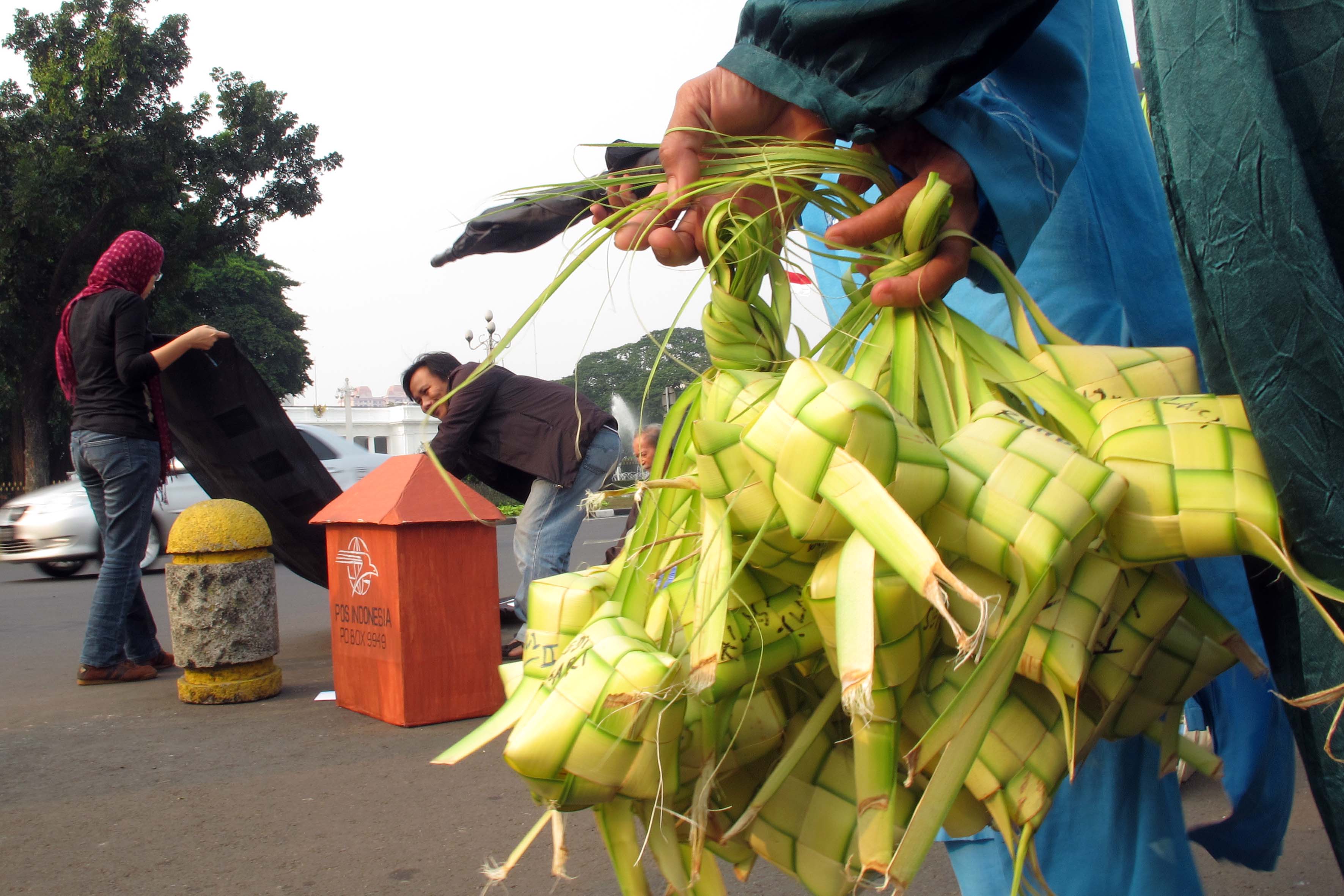 Peserta aksi membawa ketupat yang dihiasi oleh catatan kasus kekerasan dan pelanggaran HAM yang belum selesai saat mengikuti aksi diam “kamisan” di depan Istana Merdeka, Jakarta, 25 Agustus 2011. Ketupat yang di bawa oleh peserta aksi tersebut merupakan simbol pengingat masih banyaknya kasus tindak kekerasan dan pelanggaran HAM di Indonesia yang belum terkuak dan mendapat pertanggung jawaban. – JP/ Jerry Adiguna