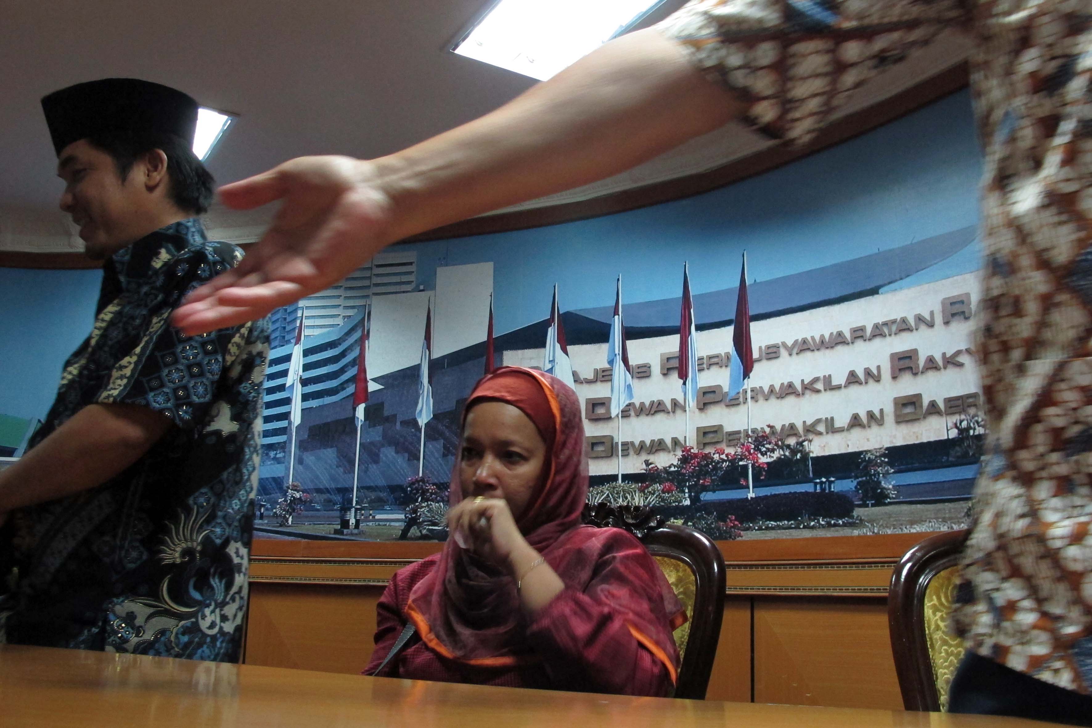 Een Nuraeni (R), anak kandung almarhum Ruyati, menahan air mata saat duduk di samping, Effendi Gazali (R), Ray Rangkuti (3rd L), dan Tamrin Amal Tomagola (R), akademisi dari Universitas Indonesia, saat bersama-sama menyatakan sikap yang menolak pemberian gelar Doktor Honoris Causa dari Universitas Indonesia kepada raja Saudi Arabia, King Abdullah, saat memberikan keterangan pers di gedung DPR-RI, Jakarta, 26 Agustus 2011. Sejumlah tokoh akademis, civil society dan perwakilan parlemen memprotes keputusan rektor Universitas Indonesia yang memberikan gelar doktor Honoris Causa kepada raja Saudi Arabia atas perhatiannya pada perkembangan kemanusiaan, IPTEK serta menjadikan Saudi Arabia sebagai pusat peradaban Islam moderat. = JP/ Jerry Adiguna