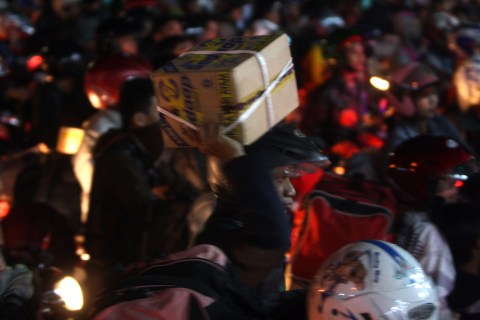 Seorang lelaki mengangkat kotak kardus sembari berusaha menembus antrian motor, saat menunggu giliran untuk naik ke kapal Ferry dari pelabuhan Merak, Banten, 27 Agustus 2011. – JP/ Jerry Adiguna