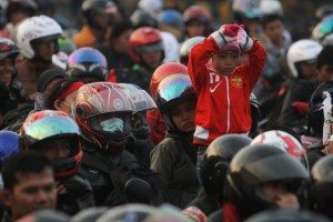 Seorang anak perempuan berdiri di atas motor saat bersama orang tuanya menunggu giliran naik ke kapal Ferry di pelabuhan Merak, Banten, 27 Agustus 2011. – JP/ Jerry Adiguna