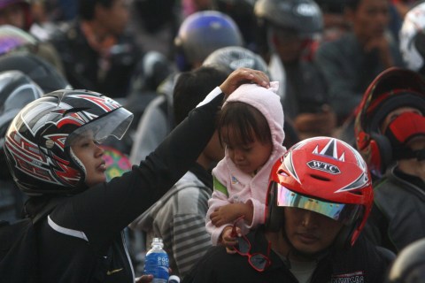 Seorang anak perempuan berdiri di atas motor saat bersama orang tuanya menunggu giliran naik ke kapal Ferry di pelabuhan Merak, Banten, 27 Agustus 2011. – JP/ Jerry Adiguna