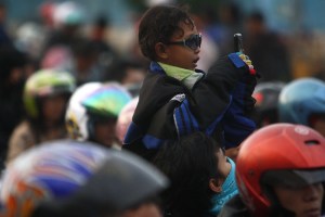 Seorang anak perempuan berdiri di atas motor sembari memainkan telepon selularnya saat bersama orang tuanya menunggu giliran untuk menaiki kapal Ferry dan menyeberang ke pulau Sumatera dari pelabuhan Merak, Banten, 27 Agustus 2011. – JP/ Jerry Adiguna