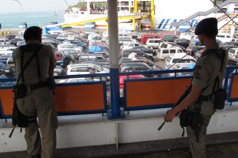 JPVJA110827043P Anggota polisi berjaga di salah satu sudut pelabuhan Merak, Banten, 27 Agustus 2011. – JP/ Jerry Adiguna Leave a comment