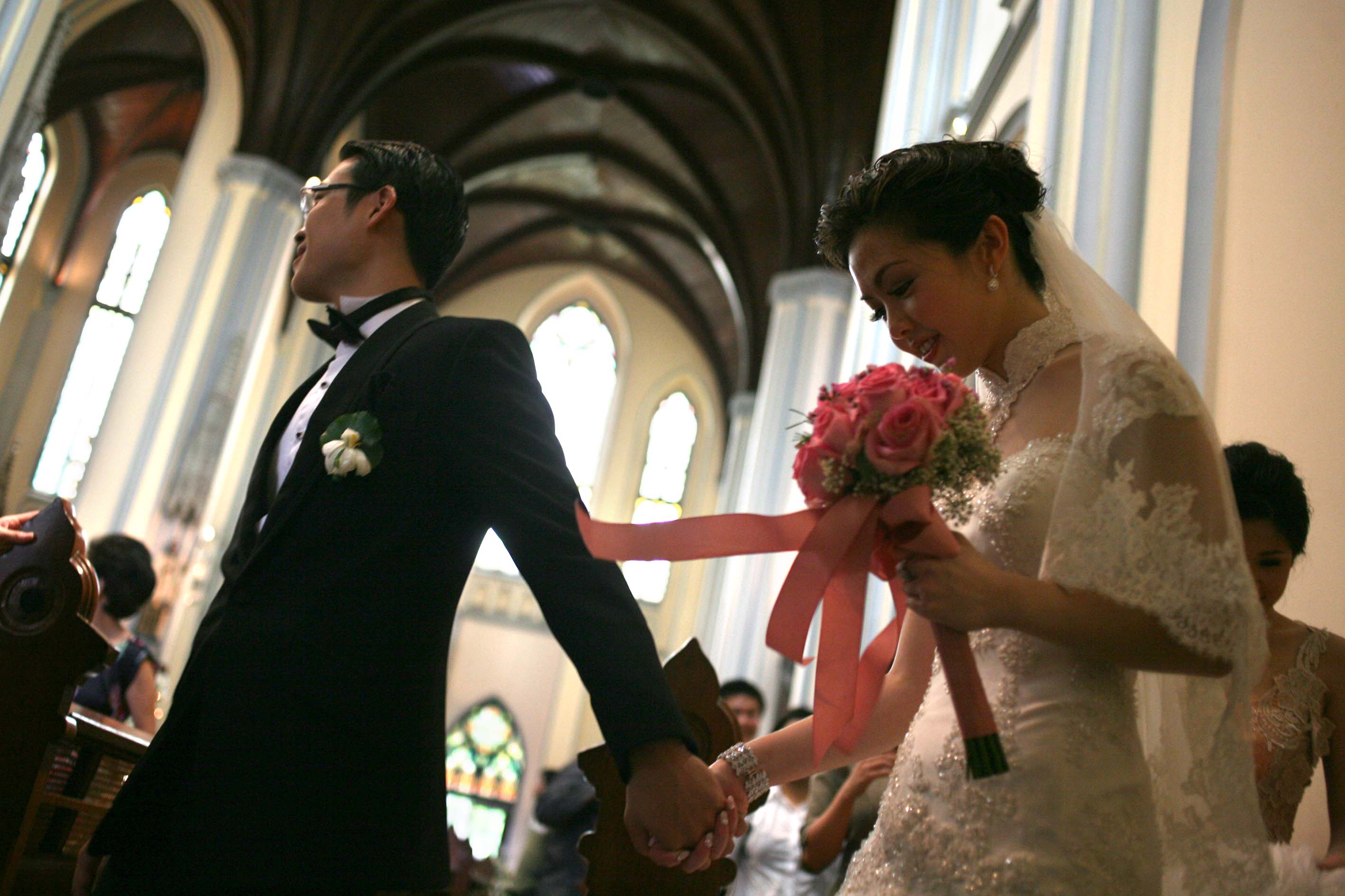Pasangan mempelai Kennardi Gunawan dan Valeria Bryna melangsungkan pernikahan mereka di gereja Katedral Paroki St.Maria Diangkat ke Surga, Jakarta, Jumat, 11 November 2011. Kennardi dan Bryna menjadi salah satu pasangan dari jutaan pasangan di dunia yang melakukan pernikahan pada tanggal 11 November 2011 yang di anggap mengandung simbol khusus. – JP/ Jerry Adiguna