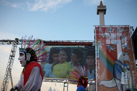 Kesenian Ondel-ondel tampil pada acara relay pembukaan Sea Games XXVI di Monas, Jakarta, yang di selenggarakan oleh Pemerintah Daerah Ibu Kota Jakarta untuk memeriahkan pelaksaan Sea Games XXVI di Indonesia, 11 November 2011. – JP/ Jerry Adiguna