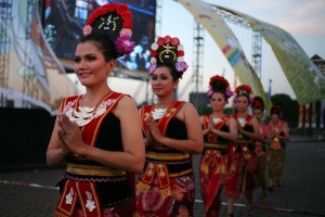 Penari dengan kostum khas betawi tampil pada acara relay pembukaan Sea Games XXVI di Monas, Jakarta, yang di selenggarakan oleh Pemerintah Daerah Ibu Kota Jakarta untuk memeriahkan pelaksaan Sea Games XXVI di Indonesia, 11 November 2011. – JP/ Jerry Adiguna
