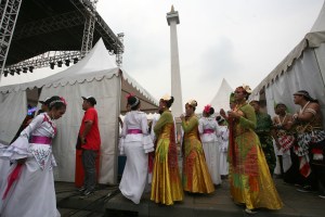 Penari dengan kostum tradisional khas Indonesia, bersiap untuk tampil pada perayaan HUT Monas ke-50 di Lapangan Monas, Jakarta, Selasa, 29 November 2011. Dalam sambutannya pada acara tersebut, gubernur Jakarta Fauzi Bowo menyerukan kepada warga Jakarta untuk turut memelihara Monumen yang menjadi salah satu kebanggaan Indonesia tersebut dan tidak mengubahnya menjadi lapangan sampah terbesar di Jakarta. – JP/ Jerry Adiguna