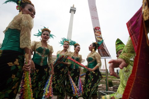 Penari dengan kostum tradisional khas Indonesia, bersiap untuk tampil pada perayaan HUT Monas ke-50 di Lapangan Monas, Jakarta, Selasa, 29 November 2011. Dalam sambutannya pada acara tersebut, gubernur Jakarta Fauzi Bowo menyerukan kepada warga Jakarta untuk turut memelihara Monumen yang menjadi salah satu kebanggaan Indonesia tersebut dan tidak mengubahnya menjadi lapangan sampah terbesar di Jakarta. – JP/ Jerry Adiguna