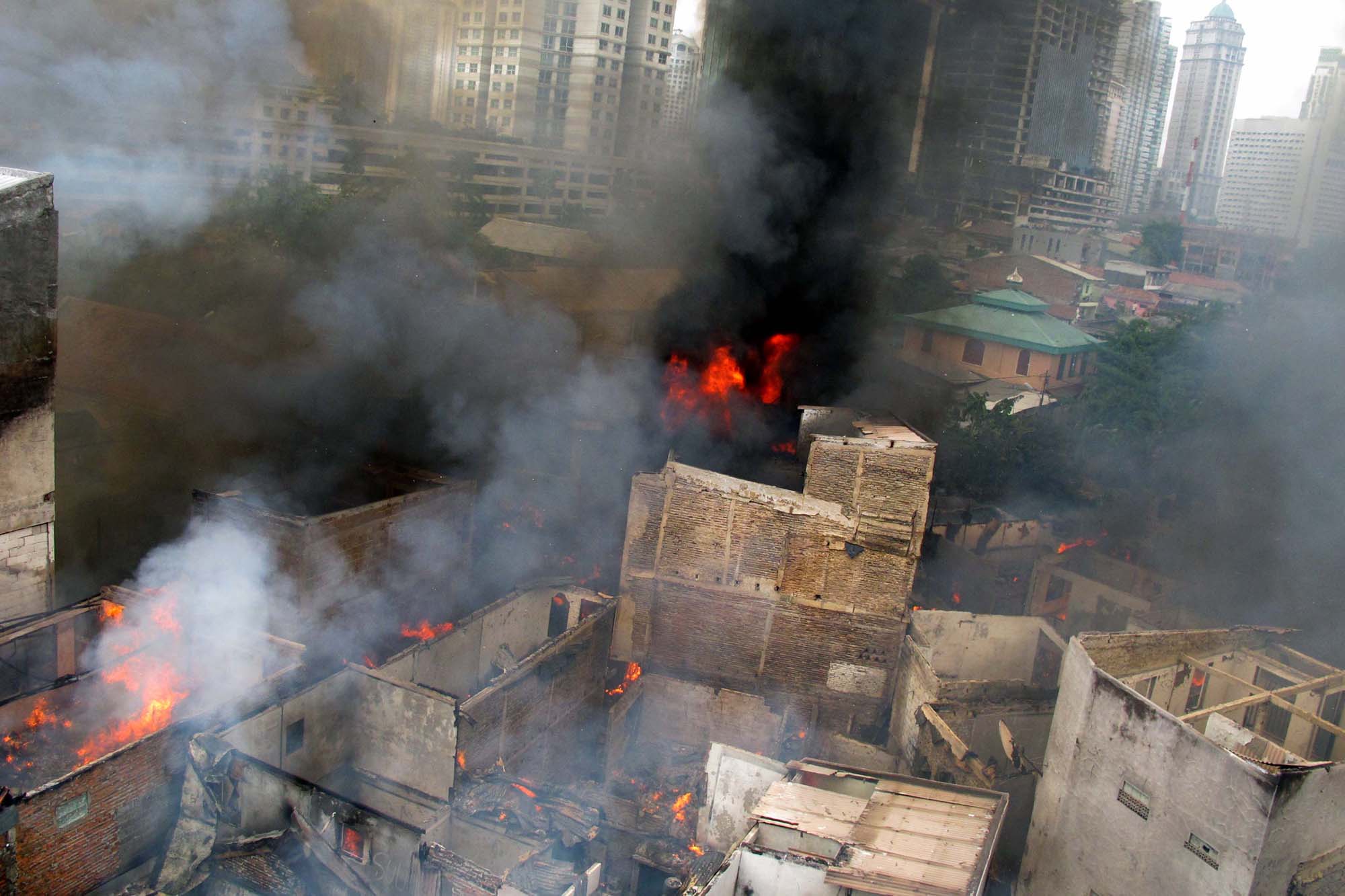 Warga berusaha memadamkan api yang menghanguskan salah satu rumah di kawasan Bendungan Hilir, Jakarta, 27 September 2011. Dua orang jurnalis foto dan seorang warga mengalami luka berat dan harus menjalani perawatan akibat kebakaran yang menghanguskan puluhan rumah penduduk tersebut. – JP/ Jerry Adiguna