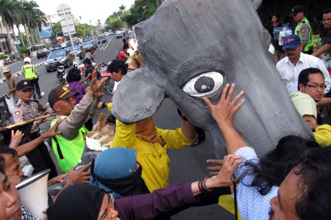 Petugas polisi mengamankan replika kepala kerbau yang di bawa oleh aktivis mahasiswa yang tergabung dalam Front Aksi Mahasiswa Universitas Indonesia saat melakukan aksi unjuk rasa memprotes kebijakan reshuffle kabinet di kawasan Imam Bonjol, Jakarta, 19 Oktober 2011. Gelombang protes atas kebijakan reshuffle kabinet yang di nilai tidak sejalan dengan kebutuhan bangsa yang tengah carut marut oleh praktek korupsi semakin gencar di lakukan oleh sejumlah aliansi aksi mahasiswa yang menuntut penegakan reformasi dan demokrasi di Indonesia. – JP/ Jerry Adiguna