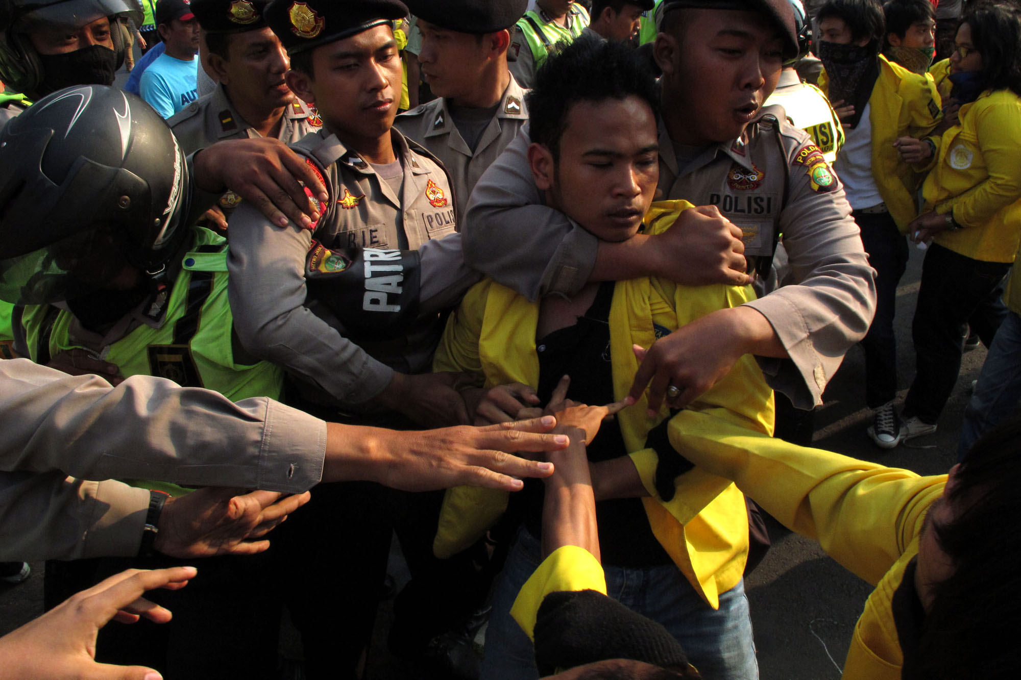 Petugas polisi mengamankan salah seorang aktivis mahasiswa yang tergabung dalam Front Aksi Mahasiswa Universitas Indonesia yang melakukan aksi unjuk rasa memprotes kebijakan reshuffle kabinet di kawasan Imam Bonjol, Jakarta, 19 Oktober 2011. Gelombang protes atas kebijakan reshuffle kabinet yang di nilai tidak sejalan dengan kebutuhan bangsa yang tengah carut marut oleh praktek korupsi semakin gencar di lakukan oleh sejumlah aliansi aksi mahasiswa yang menuntut penegakan reformasi dan demokrasi di Indonesia. – JP/ Jerry Adiguna