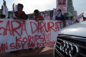 Sejumlah aktivis mahasiswa gabungan dari sejumlah elemen gerakan mahasiswa membawa poster dan spanduk sejumlah tokoh yang di duga terkait dengan kasus korupsi dan skandal Bank Century saat melakukan aksi peringatah hari anti korupsi di kawasan Bundaran Hotel Indonesia, Jakarta, Jumat, 9 Desember 2011. Dalam aksi tersebut, aktivis menyerukan mosi tidak percaya pada tekad dan kesungguhan pemerintah dalam memberantas korupsi di Indonesia serta mengancam untuk langsung menangkap sendiri sejumlah tokoh yang di duga terlibat dalam sejumlah kasus korupsi dan skandal Bank Century. – JP/ Jerry Adiguna