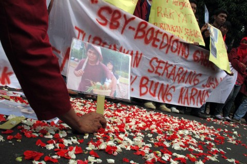 Aktivis mahasiswa meletakkan foto almarhum Sondang Hutagalung di tengah taburan bunga saat aksi solidaritas untuk Sondang Hutagalung di Salemba, Jakarta, Rabu, 14 November 2011. Aksi yang di organisir oleh elemen gerakan mahasiswa Universitas Bung Karno tersebut untuk mengenang almarhum Sondang Hutagalung mahasiswa Universitas Bung Karno yang tewas bakar diri di depan Istana Negara beberapa waktu lalu. – JP/ Jerry Adiguna