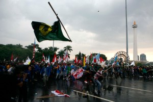 Aktivis mahasiswa melemparkan tongkat ke arah petugas saat melakukan aksi unjuk rasa menolak rencana kenaikan harga BBM di kawasan Gambir, Jakarta, Selasa, 27 Maret 2012. Aksi yang di ikuti oleh sejumlah elemen gabungan mahasiswa tersebut berakhir bentrok dengan petugas polisi. Sejumlah aktivis mahasiswa di amankan untuk di mintai keterangan oleh aparat yang berwajib. – JP/ Jerry Adiguna
