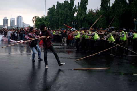 Aktivis mahasiswa melemparkan tongkat ke arah petugas saat melakukan aksi unjuk rasa menolak rencana kenaikan harga BBM di kawasan Gambir, Jakarta, Selasa, 27 Maret 2012. Aksi yang di ikuti oleh sejumlah elemen gabungan mahasiswa tersebut berakhir bentrok dengan petugas polisi. Sejumlah aktivis mahasiswa di amankan untuk di mintai keterangan oleh aparat yang berwajib. – JP/ Jerry Adiguna
