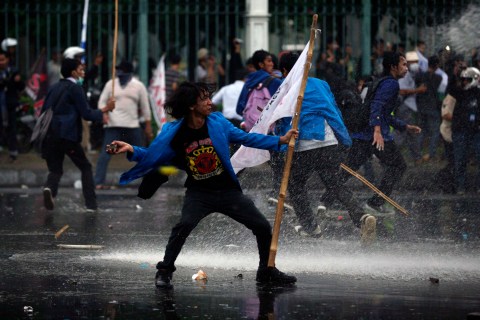 Seorang aktivis mahasiswa berlari menembus hadangan semprotan air saat melakukan aksi unjuk rasa menolak rencana kenaikan BBM di kawasan Gambir, Jakarta, Selasa, 27 Maret 2012. – JP/ Jerry Adiguna