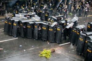 Petugas berlindung di balik tameng saat mengamankan aksi unjuk rasa menolak rencana kenaikan harga BBM di kawasan Gambir, Jakarta, Selasa, 27 Maret 2012. Aksi yang di ikuti oleh sejumlah elemen gabungan mahasiswa tersebut berakhir bentrok dengan petugas polisi. Sejumlah aktivis mahasiswa di amankan untuk di mintai keterangan oleh aparat yang berwajib. – JP/ Jerry Adiguna