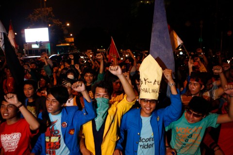 Sejumlah aktivis mahasiswa yang tergabung dalam Konsolidasi Nasional Mahasiswa Indonesia (KONAMI) mengangkat tangan kiri sembari menutup jalan saat melakukan aksi long march menolak rencana kenaikan BBM di kawasan Salemba, Jakarta, Rabu, 28 Maret 2012. Menjelang finalisasi rencana kenaikan BBM yang masih di bahas di DPR, sejumlah aksi penolakan yang dilakukan oleh mahasiswa dan elemen gerakan buruh semakin marak terjadi di sejumlah wilayah Indonesia. – JP/ Jerry Adiguna