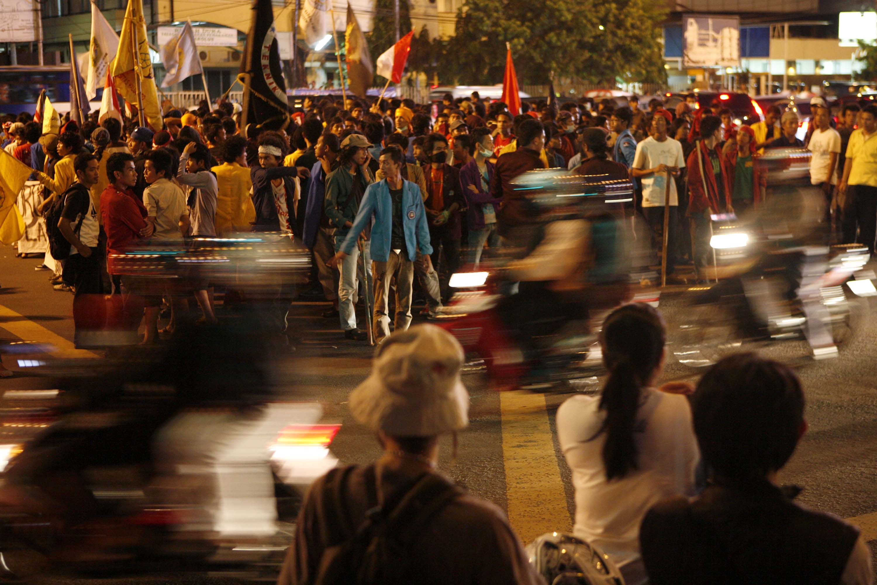 Sejumlah aktivis mahasiswa yang tergabung dalam Konsolidasi Nasional Mahasiswa Indonesia (KONAMI) berdiri menutup jalan saat melakukan aksi long march menolak rencana kenaikan BBM di kawasan Salemba, Jakarta, Rabu, 28 Maret 2012. Menjelang finalisasi rencana kenaikan BBM yang masih di bahas di DPR, sejumlah aksi penolakan yang dilakukan oleh mahasiswa dan elemen gerakan buruh semakin marak terjadi di sejumlah wilayah Indonesia. – JP/ Jerry Adiguna