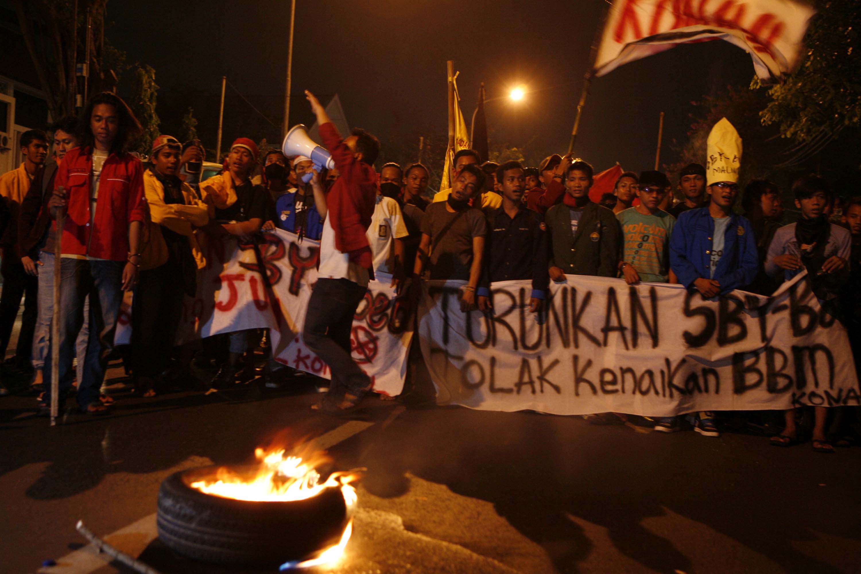 Sejumlah aktivis mahasiswa yang tergabung dalam Konsolidasi Nasional Mahasiswa Indonesia (KONAMI) berdiri mengangkat spanduk di depan ban yang mereka bakar menutup jalan saat melakukan aksi long march menolak rencana kenaikan BBM di kawasan Proklamasi, Jakarta, Rabu, 28 Maret 2012. Menjelang finalisasi rencana kenaikan BBM yang masih di bahas di DPR, sejumlah aksi penolakan yang dilakukan oleh mahasiswa dan elemen gerakan buruh semakin marak terjadi di sejumlah wilayah Indonesia. – JP/ Jerry Adiguna
