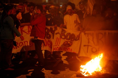 Sejumlah aktivis mahasiswa yang tergabung dalam Konsolidasi Nasional Mahasiswa Indonesia (KONAMI) berdiri mengangkat spanduk di depan ban yang mereka bakar menutup jalan saat melakukan aksi long march menolak rencana kenaikan BBM di kawasan Proklamasi, Jakarta, Rabu, 28 Maret 2012. Menjelang finalisasi rencana kenaikan BBM yang masih di bahas di DPR, sejumlah aksi penolakan yang dilakukan oleh mahasiswa dan elemen gerakan buruh semakin marak terjadi di sejumlah wilayah Indonesia. – JP/ Jerry Adiguna