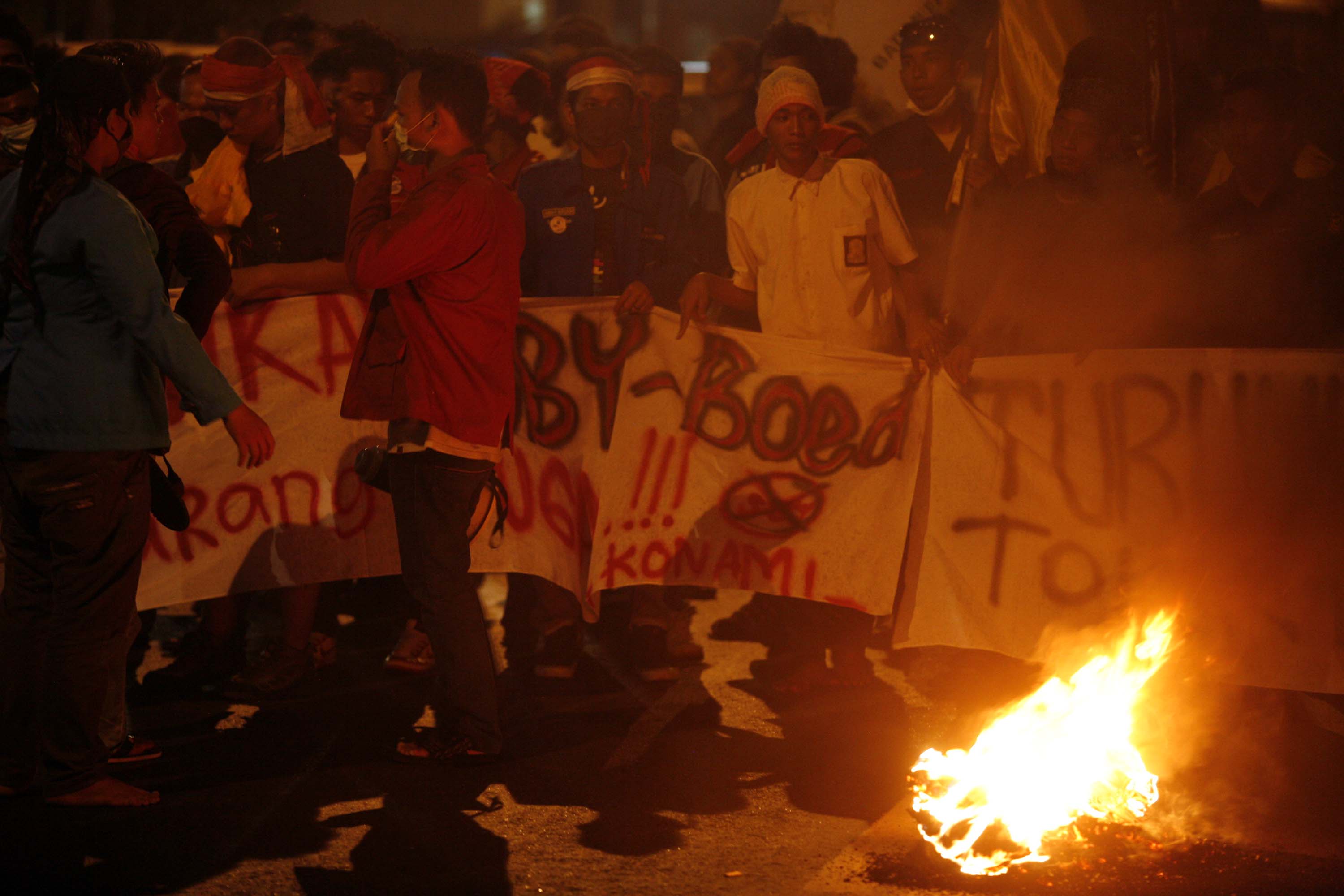 Sejumlah aktivis mahasiswa yang tergabung dalam Konsolidasi Nasional Mahasiswa Indonesia (KONAMI) berdiri mengangkat spanduk di depan ban yang mereka bakar menutup jalan saat melakukan aksi long march menolak rencana kenaikan BBM di kawasan Proklamasi, Jakarta, Rabu, 28 Maret 2012. Menjelang finalisasi rencana kenaikan BBM yang masih di bahas di DPR, sejumlah aksi penolakan yang dilakukan oleh mahasiswa dan elemen gerakan buruh semakin marak terjadi di sejumlah wilayah Indonesia. – JP/ Jerry Adiguna
