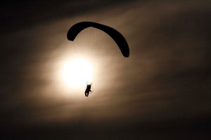 Siluet penerbang para-layang saat melintas di area upacara peringatan HUT ke-66 TNI-AU di Pangkalan Udara TNI AU Halim Perdanakusuma, Jakarta Timur, Senin, 9 Januari 2012. Peringatan Hari Angkatan Udara yang melibatkan 2.560 Personel TNI AU itu dilanjutkan dengan demo udara dan keterampilan prajurit TNI AU. – JP/ Jerry Adiguna