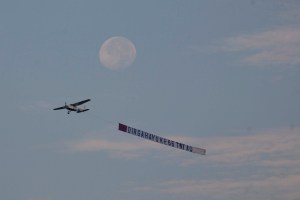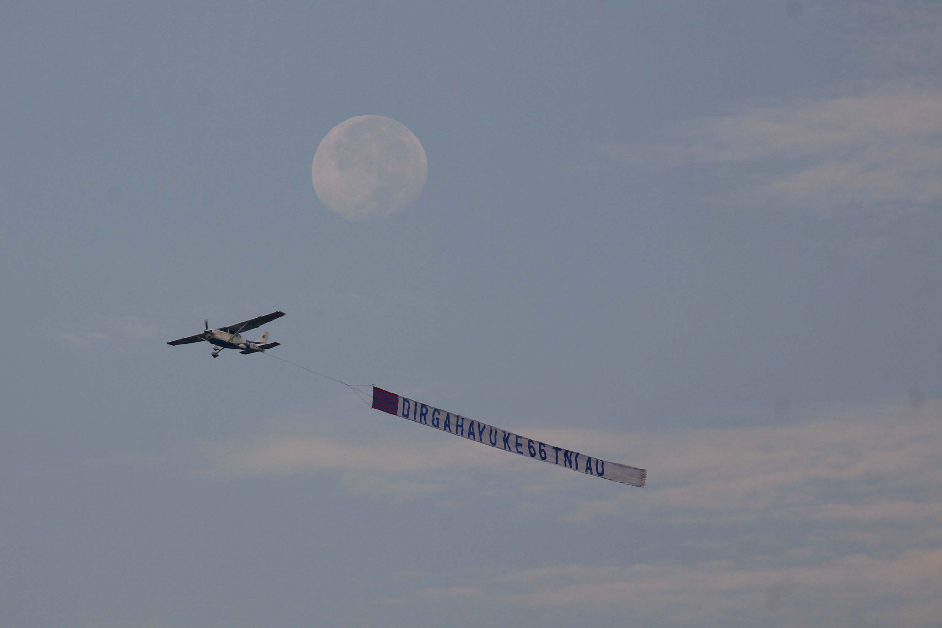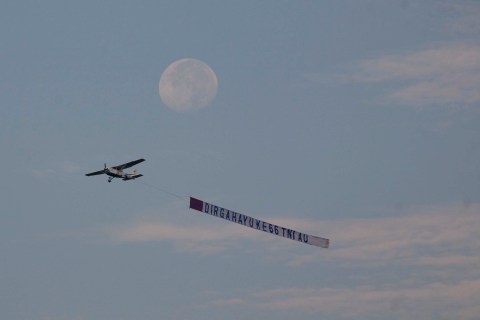 Pesawat dengan spanduk ucapan selamat kepada TNI-AU melintas di area upacara peringatan HUT ke-66 TNI-AU di Pangkalan Udara TNI AU Halim Perdanakusuma, Jakarta Timur, Senin, 9 Januari 2012. Peringatan Hari Angkatan Udara yang melibatkan 2.560 Personel TNI AU itu dilanjutkan dengan demo udara dan keterampilan prajurit TNI AU. – JP/ Jerry Adiguna