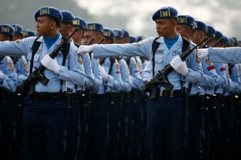 Prajurit TNI-AU berbaris di area upacara peringatan HUT ke-66 TNI-AU di Pangkalan Udara TNI AU Halim Perdanakusuma, Jakarta Timur, Senin, 9 Januari 2012. Peringatan Hari Angkatan Udara yang melibatkan 2.560 Personel TNI AU itu dilanjutkan dengan demo udara dan keterampilan prajurit TNI AU. – JP/ Jerry Adiguna