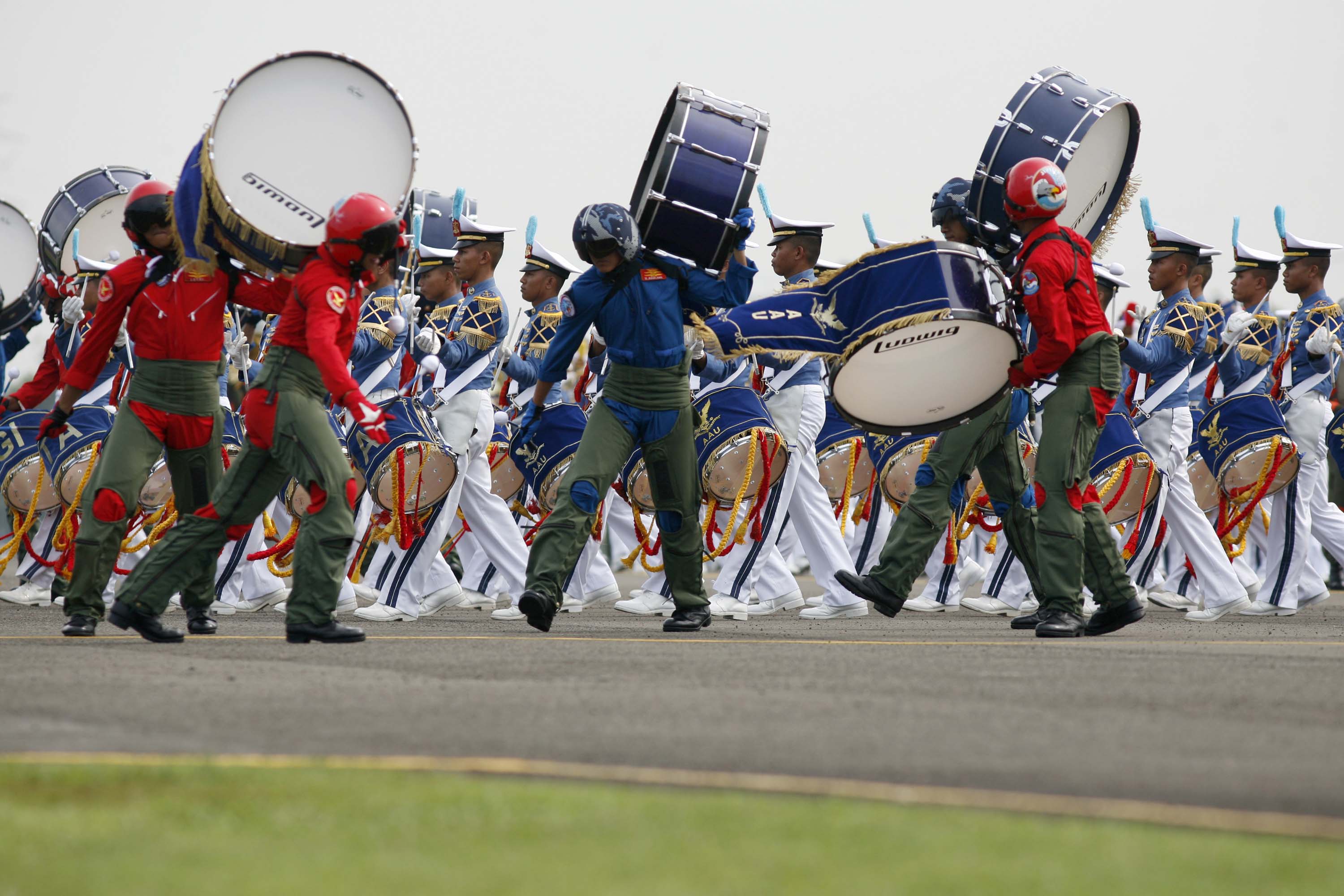 Marching Band Taruna Akademi Angkatan Udara tampil menghibur pengunjung di area upacara peringatan HUT ke-66 TNI-AU di Pangkalan Udara TNI AU Halim Perdanakusuma, Jakarta Timur, Senin, 9 Januari 2012. Peringatan Hari Angkatan Udara yang melibatkan 2.560 Personel TNI AU itu dilanjutkan dengan demo udara dan keterampilan prajurit TNI AU. – JP/ Jerry Adiguna