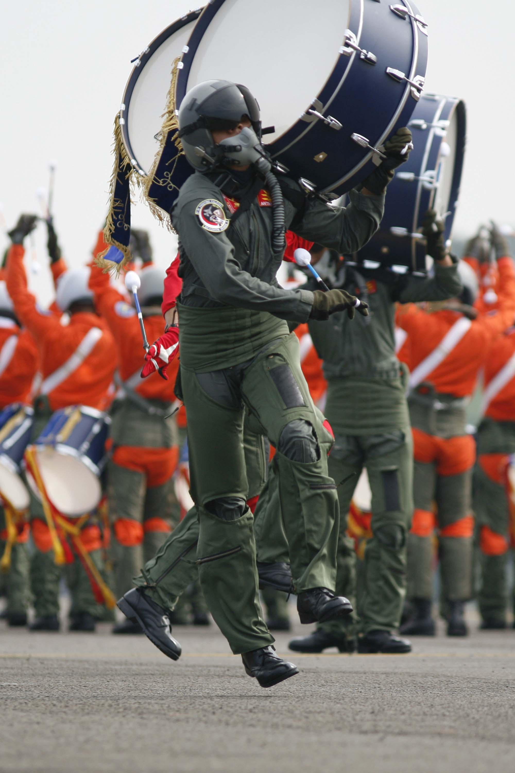 Marching Band Taruna Akademi Angkatan Udara tampil menghibur pengunjung di area upacara peringatan HUT ke-66 TNI-AU di Pangkalan Udara TNI AU Halim Perdanakusuma, Jakarta Timur, Senin, 9 Januari 2012. Peringatan Hari Angkatan Udara yang melibatkan 2.560 Personel TNI AU itu dilanjutkan dengan demo udara dan keterampilan prajurit TNI AU. – JP/ Jerry Adiguna