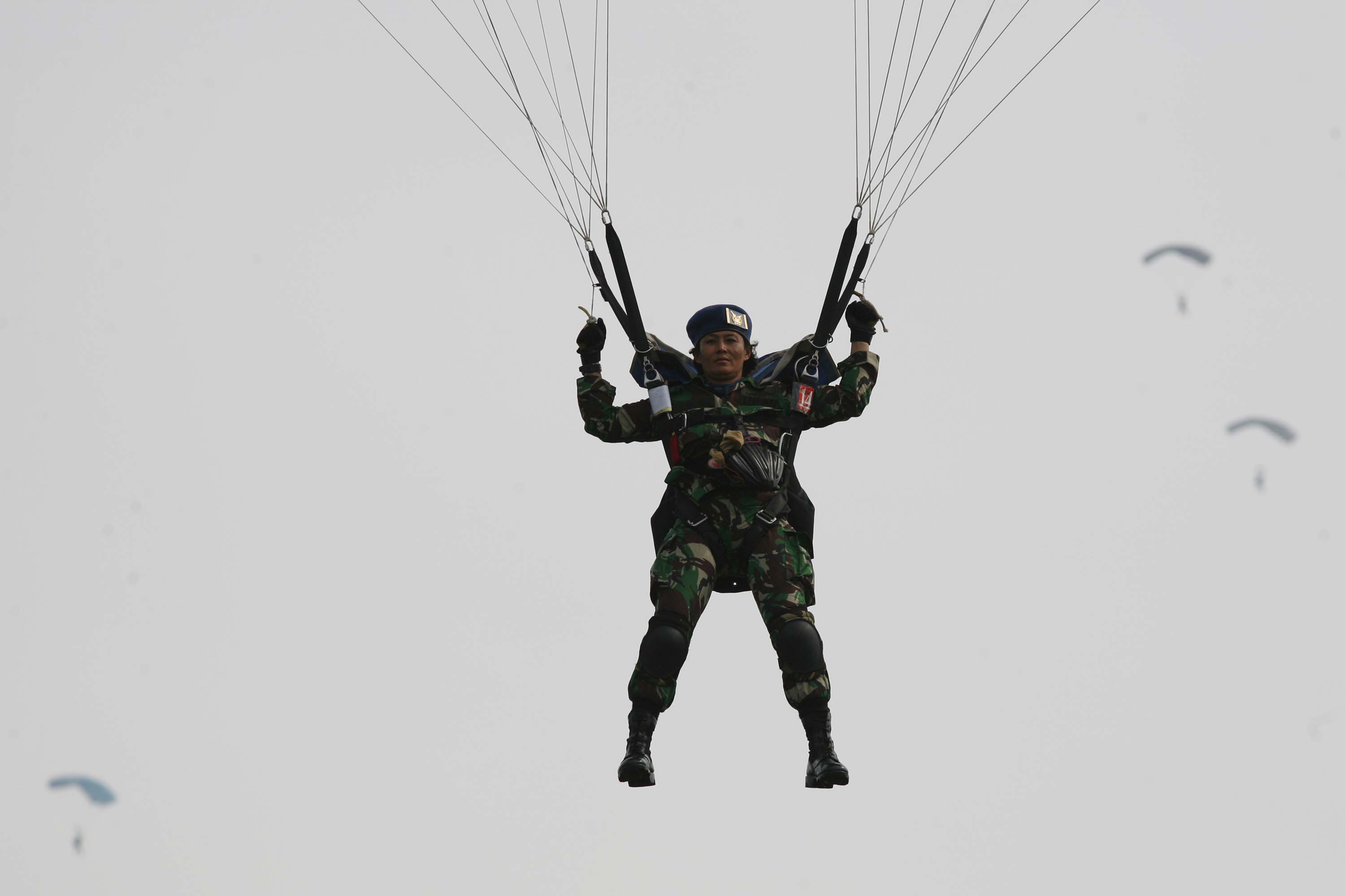 Letnan Ratna, seorang penerjun perempuan TNI-AU mendarat di area upacara peringatan saat tampil dalam atraksi terjun payung pada HUT ke-66 TNI-AU di Pangkalan Udara TNI AU Halim Perdanakusuma, Jakarta Timur, Senin, 9 Januari 2012. Peringatan Hari Angkatan Udara yang melibatkan 2.560 Personel TNI AU itu dilanjutkan dengan demo udara dan keterampilan prajurit TNI AU. – JP/ Jerry Adiguna