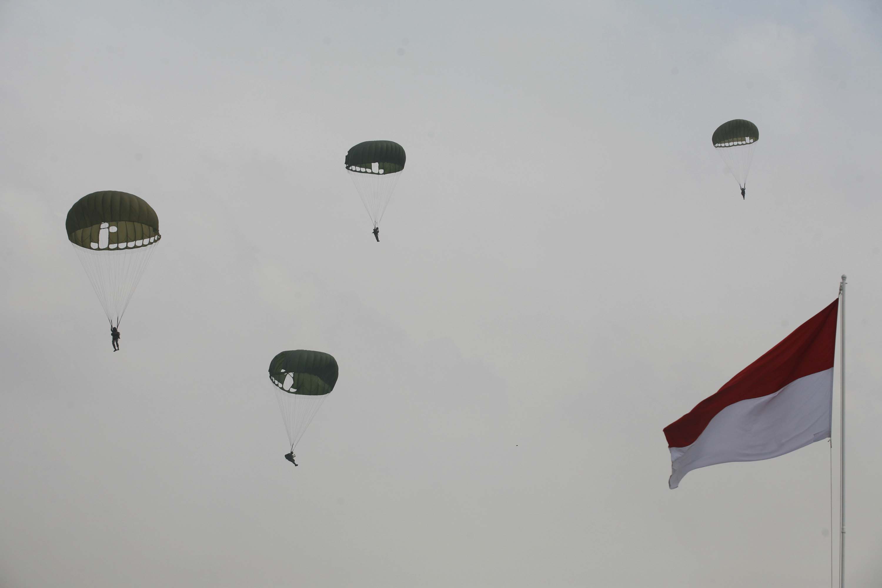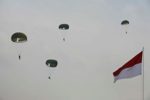 Prajurit TNI-AU melakukan demo penerjunan tempur pada peringatan Hari Angkatan Udara ke-66 di Pangkalan Udara TNI AU Halim Perdanakusuma, Jakarta Timur, Senin (9/4). Peringatan Hari Angkatan Udara yang melibatkan 2.560 Personel TNI AU itu dilanjutkan dengan demo udara dan keterampilan prajurit. – JP/ Jerry Adiguna