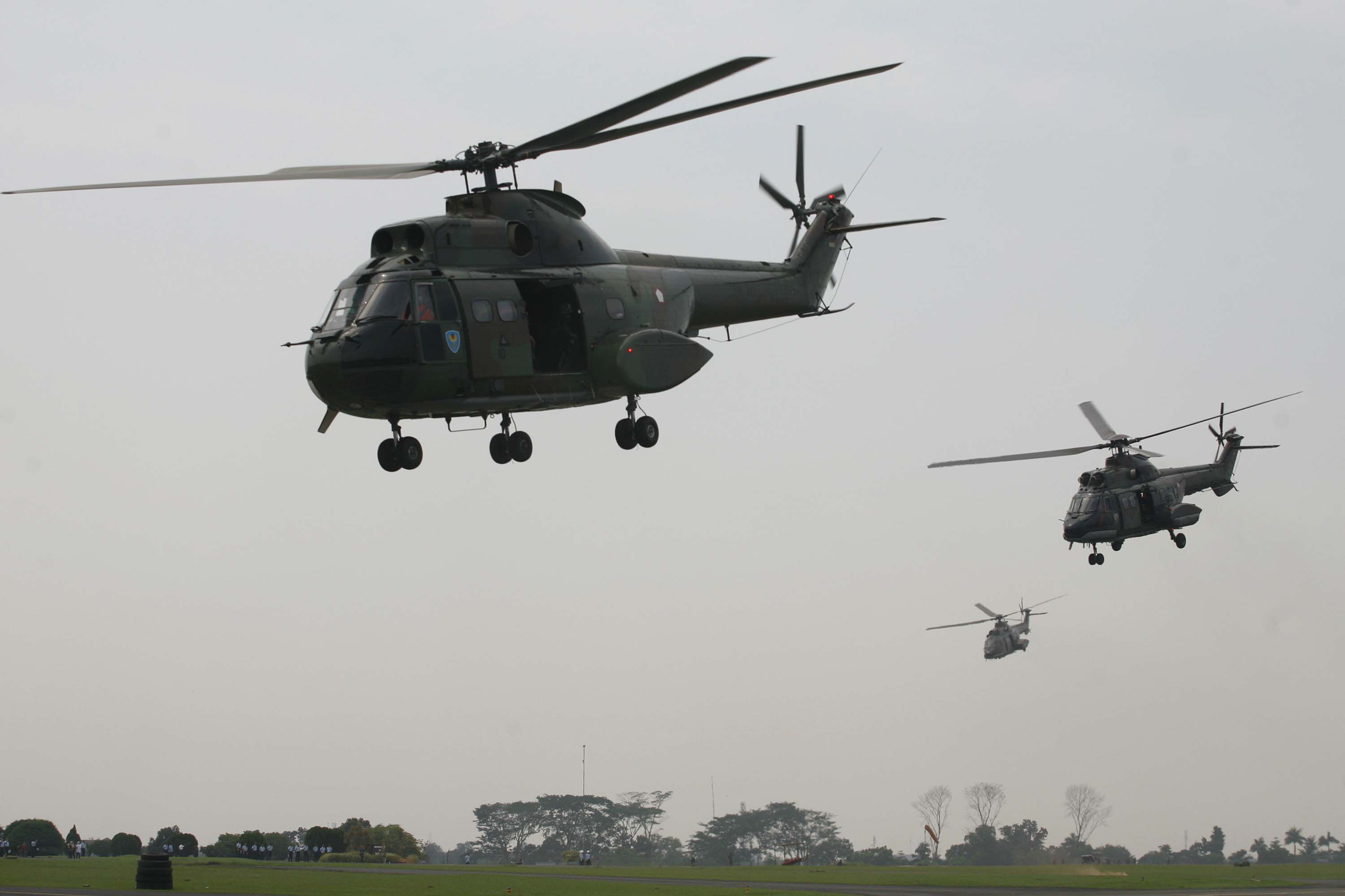 Helikopter Super Puma TNI AU melakukan demo operasi tempur pada peringatan Hari Angkatan Udara ke-66 di Pangkalan Udara TNI AU Halim Perdanakusuma, Jakarta Timur, Senin (9/4). Peringatan Hari Angkatan Udara yang melibatkan 2.560 Personel TNI AU itu dilanjutkan dengan demo udara dan keterampilan prajurit. – JP/ Jerry Adiguna
