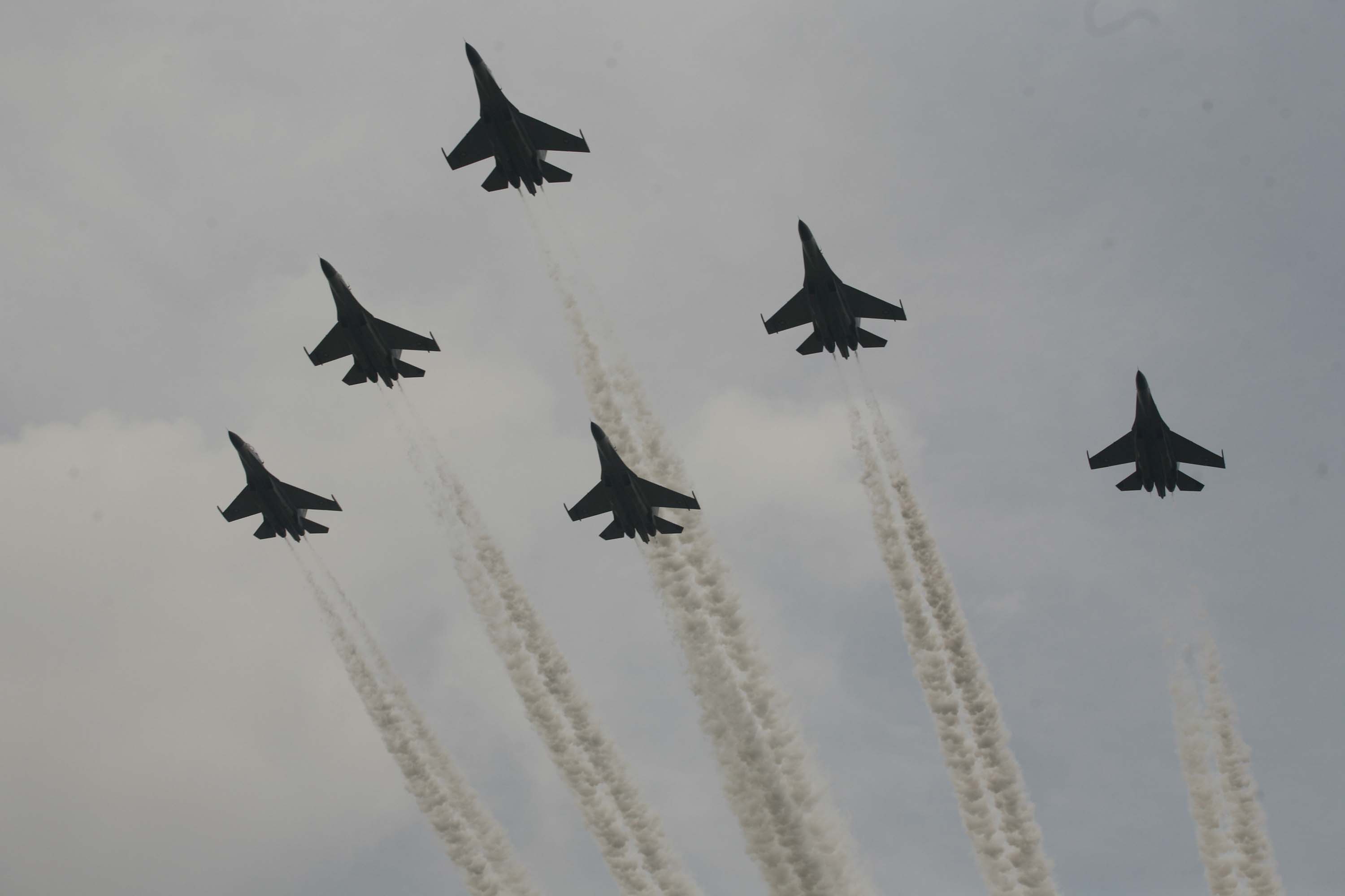 Sejumlah Jet tempur Sukhoi melakukan “Flying Pass” pada peringatan Hari Angkatan Udara ke-66 di Pangkalan Udara TNI AU Halim Perdanakusuma, Jakarta Timur, Senin, 9 Januari 2012. Peringatan Hari Angkatan Udara yang melibatkan 2.560 Personel TNI AU itu dilanjutkan dengan demo udara dan keterampilan prajurit. – JP/ Jerry Adiguna