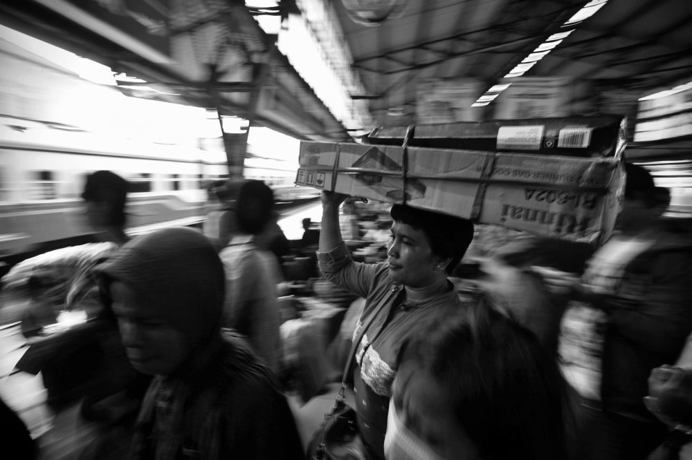 A woman caries a new stove while waiting for train in Senen Train Station, Jakarta, August, 2012. – The Jakarta Post / Jerry Adiguna