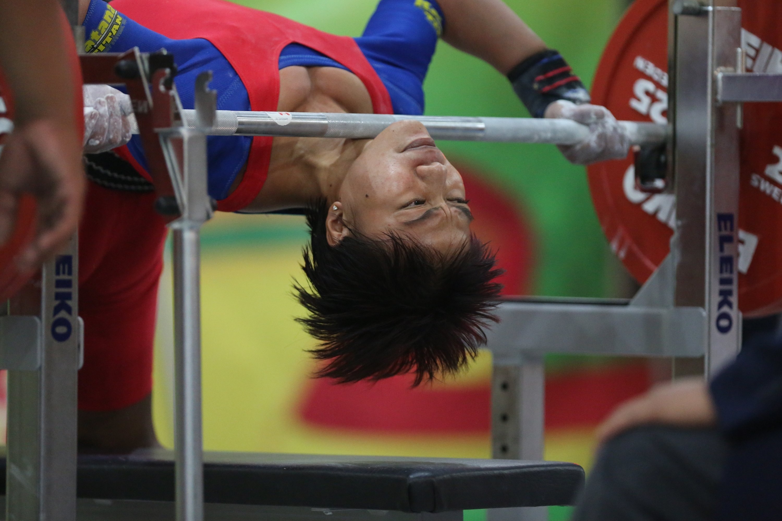 Atlet Angkat Berat Lampung, Sri Hartati berusaha mengangkat barbel saat tampil pada kategori B. Press final angkat berat putri kelas 57kg Pekan Olahraga Nasional (PON) ke-18 di hotel Mayang Sari Garden, Pekanbaru, Riau, Minggu, 16 September 2012. Atlet Angkat berat Lampung, Sri Hartati meraih medali emas dengan total angkatan 553kg dan memecahkan rekor Asia di kelas B. Press. – The Jakarta Post / Jerry Adiguna