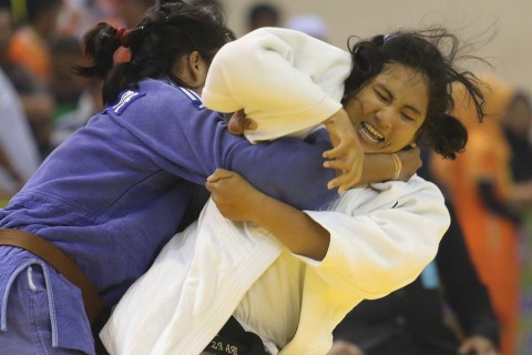 Judoka Jawa Barat, Ira Purnamasari (putih) berusaha melakukan bantingan atas lawannya, Judoka Jawa Timur, Vika Irma Safitri saat bertanding pada Final Judo kelas -78 putri Pekan Olahraga Nasional (PON) ke-18 di GOR Tribuana, Pekanbaru, Riau, Minggu, 16 September 2012. ira Purnamasari memenangkan pertandingan dan mempersembahkan medali emas bagi Jawa Barat. – The Jakarta Post / Jerry Adiguna