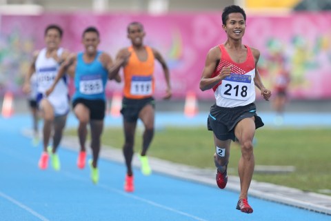 Pelari Nusa Tenggara Barat, Ridwan tersenyum merayakan kemenangan pada nomor Lari 1500 meter putra PON XVIII di Stadion Atletik Rumbai, Pekanbaru, Riau, Kamis, 13 September 2012. Ridwan meraih emas dengan catatan waktu 3 menit 53,16 detik. – The Jakarta Post / Jerry Adiguna