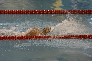 Perenang dari kontingen Riau, Gede Siman Sudartawa berusaha mendahului lawannya saat beraksi pada final cabang Renang gaya Punggung 200 meter Putra di Pekan Olah Raga Nasional (PON) Riau di Aquatic Centre, Rumbai, Pekanbaru, Minggu, 9 September 2012. Gede Siman Sudartawa akhirnya berhasil meraih medali emas dan memecahkan rekor PON dengan catatan waktu 2 menit 5 detik. – The Jakarta Post / Jerry Adiguna