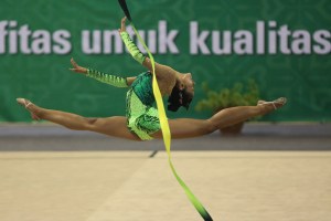 Pesenam DKI Jakarta, Dinda Defriana beraksi pada kategori ribbon final senam ritmik semua alat Pekan Olahraga Nasional (PON) ke-18 di Hall Senam Rumbai Sports Centre, Pekanbaru, Sabtu, 15 September 2012. Dinda Defriana mencatat skor tertinggi dengan total nilai 87,059 dan merebut medali emas dalam cabang tersebut. – The Jakarta Post / Jerry Adiguna