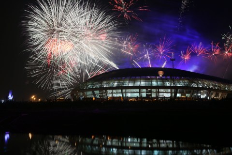 Kembang Api menyala saat upacara penutupan Pekan Olahraga Nasional ke-18 di stadion Utama Riau, Pekanbaru, Riau, Kamis, 20 September 2012. PON ke-18 secara resmi di tutup oleh wakil presiden Boediono setelah berlansung sejak tanggal 6 September 2012 dan di buka secara resmi tanggal 11 September 2012 yang lalu. – The Jakarta Post / Jerry Adiguna