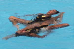 Atlet Renang Indah Sulawesi Selatan, Nike Yuniarti dan Chairuniswa tampil saat mengikuti kompetisi renang Indah Duet Free Routine Pekan Olahraga Nasional (PON) ke-18 di Aquatic Centre, Rumbai Sports Centre, Senin, 17 September 2012. – The Jakarta Post / Jerry Adiguna