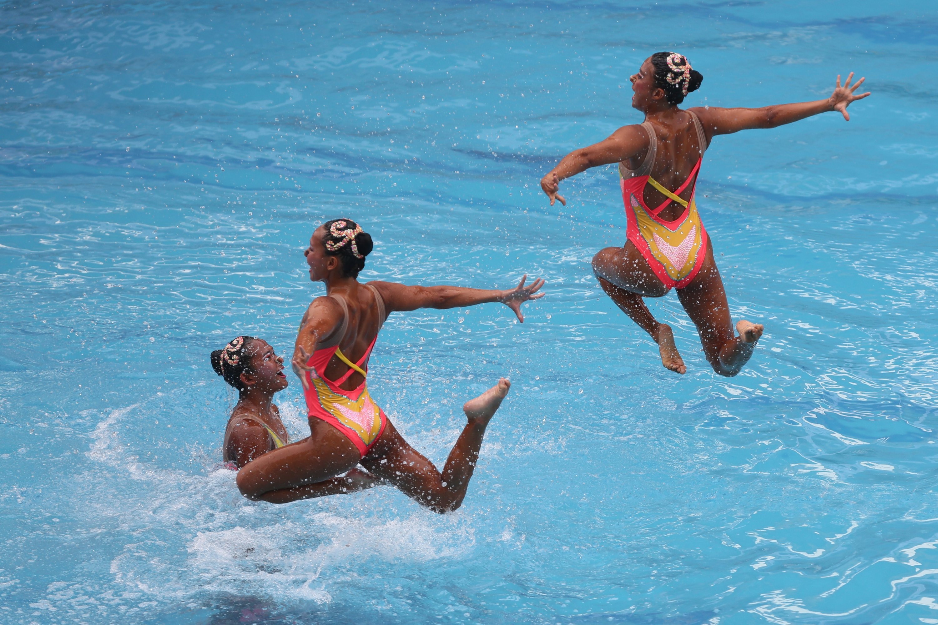 Team Renang Indah DKI Jakarta beraksi saat tampil pada kompetisi Renang Indah Team Technical Routine Pekan Olahraga Nasional (PON) ke-18 di Aquatic Centre, Rumbai, Pekanbaru, Riau, Senin, 17 September 2012. Team Renang Indah DKI Jakarta mencatat peringkat tertinggi dengan total skor 72,20 pada kelas Team Technical Routine. – The Jakarta Post / Jerry Adiguna