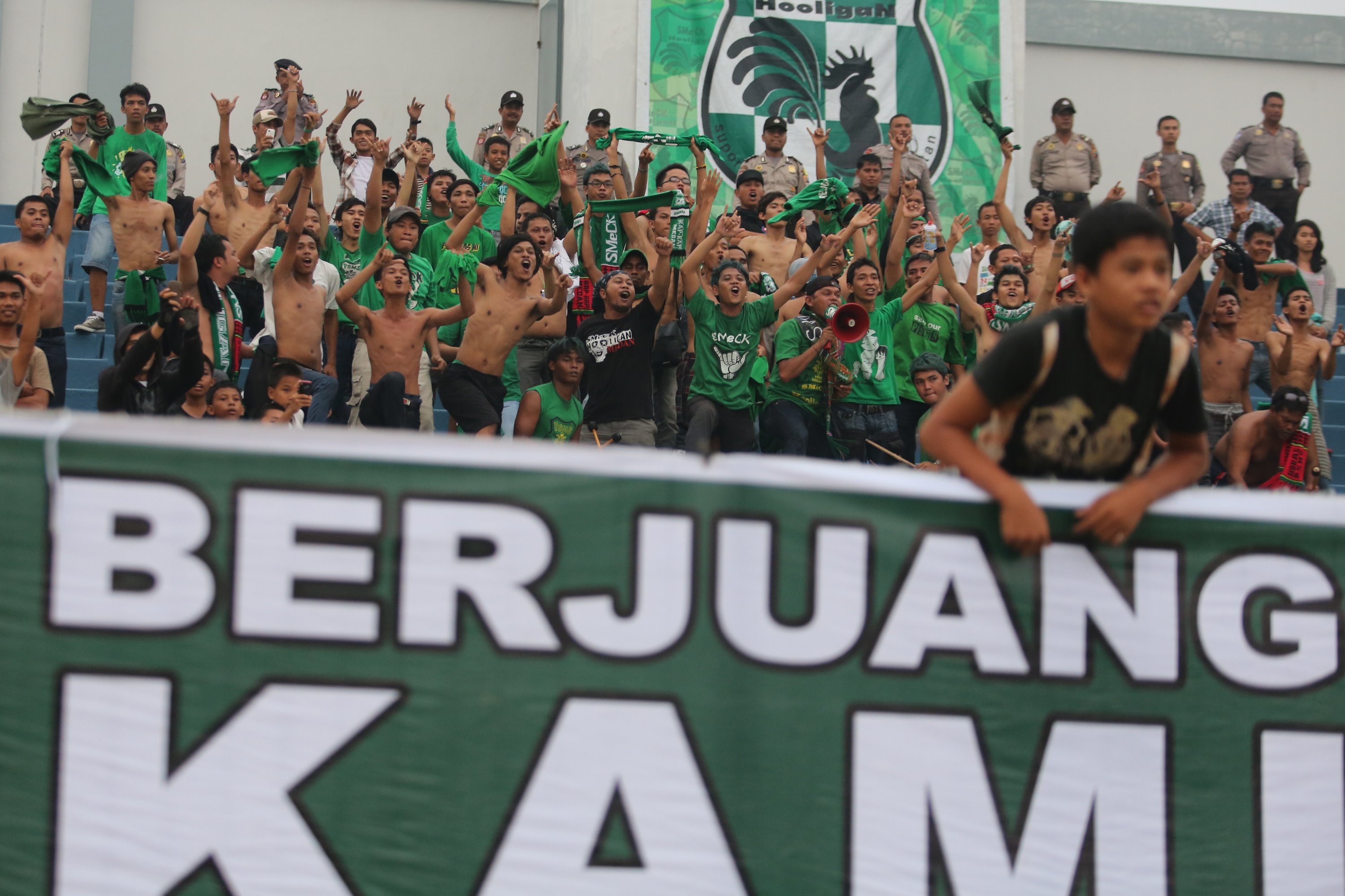 Suporter kesebelasan Sumatera Utara bersorak merayakan kemenangan Sumatera Utara atas kesebelasan Papua pada semi final sepakbola Pekan Olahraga Nasional (PON) ke-18 di Stadion Lancang Kuning, Pekanbaru, Riau, Senin, 18 September 2012. Kesebelasan Sumatera Utara menang 2-0 atas Papua dan berhak melaju ke final bertanding melawan kesebelasan Kalimantan Timur untuk memperebutkan medali emas. – The Jakarta Post / Jerry Adiguna