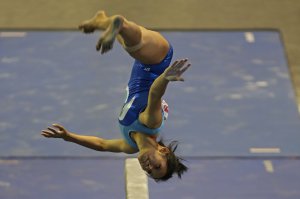 Pesenam Riau, Dewi Mustika Marni melakukan loncatan saat tampil pada Kategori balok keseimbangan final senam ritmik putri PON Riau di Stadion Senam Rumbai, Pekanbaru, Senin, 10 September 2012. – The Jakarta Post / Jerry Adiguna