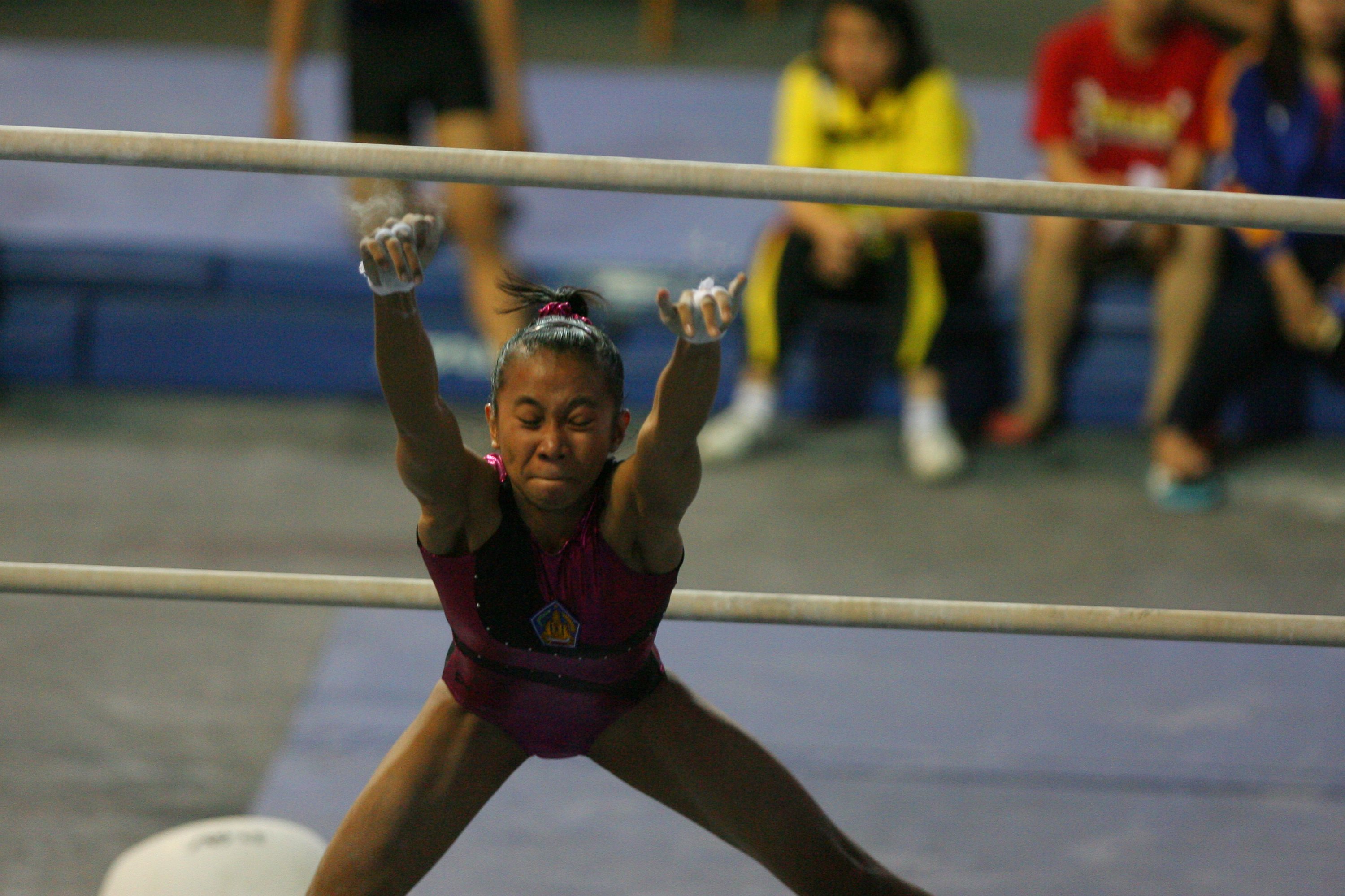 Pesenam Bali, Anak Agung Istri Candra Savitri berusaha menggapai palang saat tampil pada kategori palang bertingkat final Senam Ritmik PON Riau di Stadion Senam Rumbai, Pekanbaru, Senin, 10 Setember 2012. – The Jakarta Post / Jerry Adiguna